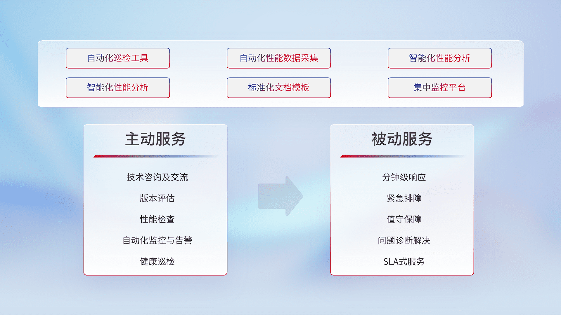 智能化工具和标准化文档,,,保障服务质量,,,,提供主动服务(包含技术咨询、、、版本评估、、性能检查、、自动化监控与告警、、、健康巡检)和被动服务包含(分钟级响应、、、紧急排障、、、、值守保障、、、问题诊断解决、、、SLA服务)。。。。