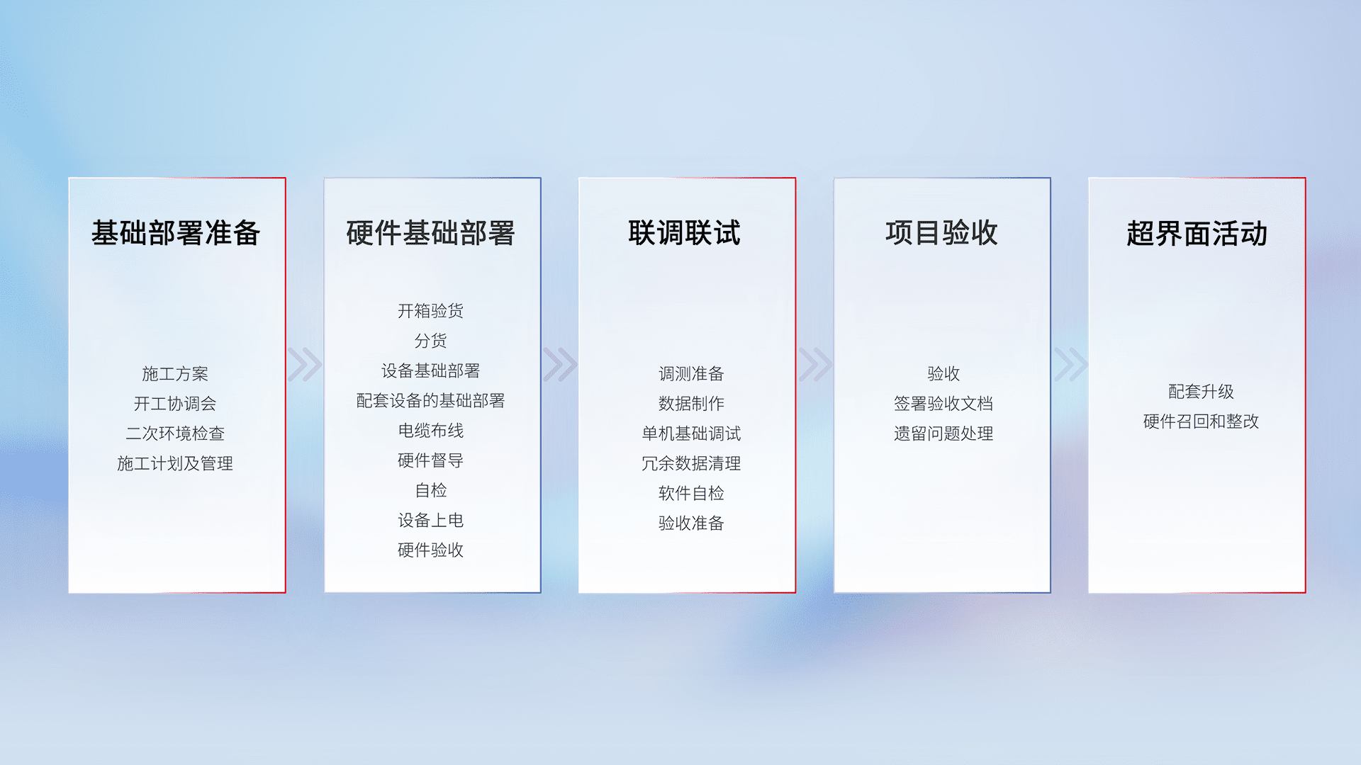 从基础部署准备、、、、硬件基础部署、、、联调联试、、、、项目验收、、、、越界面活动的全过程可追溯,,,保证施工质量和进度。。。